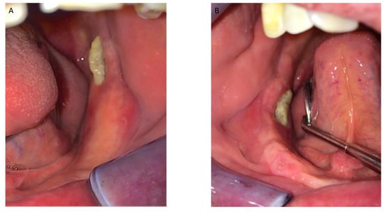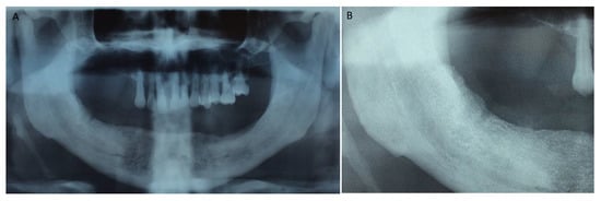 - Cardoso, C.L.; Barros, C.A.; Curra, C.; Fernandes, L.M.; Franzolin, S.O.; Júnior, J.S.; De Antoni, C.C.; Curi, M.M. Radiographic Findings in Patients with Medication-Related Osteonecrosis of the Jaw. Int. J. Dent. 2017, 2017, 3190301. [Google Scholar] [CrossRef]