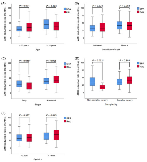 Anti-Müllerian hormone (AMH) reduction rates at 3 months postoperative according to surgical approach and each risk factor. (A) AMH reduction rate according to surgical approach and age, (B) AMH reduction rate according to surgical approach and location of cyst, (C) AMH reduction rate according to surgical approach and stage, (D) AMH reduction rate according to surgical approach and complexity of surgery, (E) AMH reduction rate according to surgical approach and cyst size.
