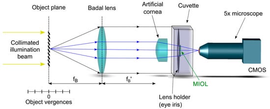 Optical bench setup. The object test can be located at different (positive or negative) vergences using the linear translation stage. The eye model is similar to the model 1 eye described in the ISO 11979-2 Norm, consisting of an artificial achromatic lens acting as an artificial cornea and a cuvette where the MIOL is immersed in a saline solution just behind the artificial iris. The aerial image behind the cuvette was recorded with a 5× microscope and a CMOS camera.