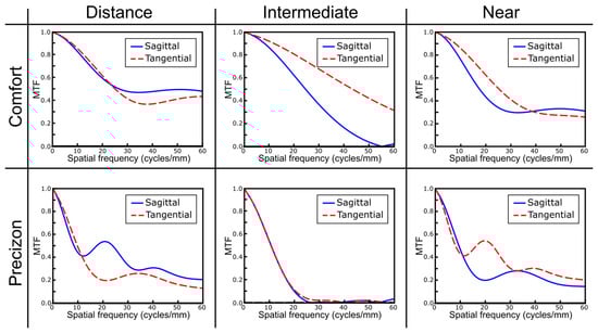Figure 3 shows the sagittal and tangential MTFs of the two refractive lenses computed numerically at the two main foci (far and near) and an intermediate plane. Note that the difference in the sagittal and tangential polychromatic MTFs is particularly evident in the far and near foci of the Precizon Presbyopic MIOL, which look like those of toric IOL with the focal lines at the near and far foci.