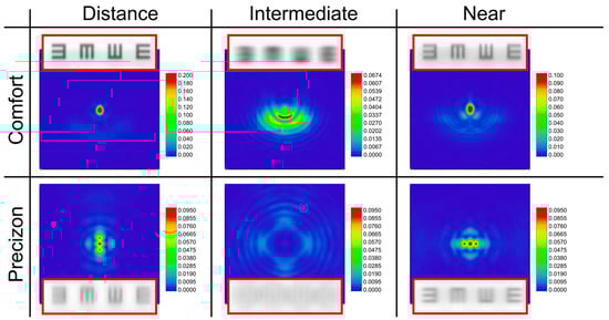 Point spread functions (PSFs) were obtained for a 3.0 mm pupil using Zemax software, corresponding to the same planes as shown in Figure 3. The color bars represent the relative intensity values. Each PSF is accompanied by a corresponding image simulation of a tumbling E optotype of 0.4 logMAR.