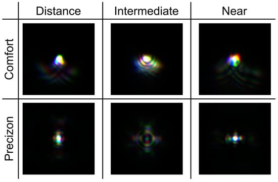 The bifocal profile of both refractive lenses can be appreciated in this figure. The different values of the near add of each lens [18,19] are also evident. The Femtis Comfort IOL is pupil-dependent providing better TF-MTFs at the far focus for the small pupil. On the other hand, the more segmented design of Precizon Presbyopic IOL demonstrates its low-pupil dependency. However, the heights of the TF-MTF peaks of this IOL are lower than those of the Femtis Comfort, especially for 3.0 mm pupil. This result is also consistent with the intensities of the PSFs shown in Figure 4 and Figure 5.
