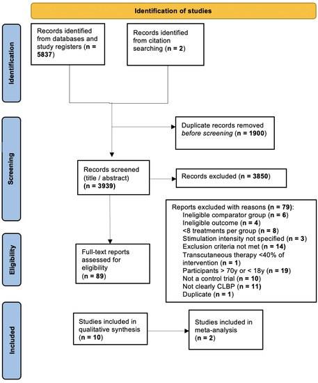 The following bibliographic databases were searched for studies pertaining to CLBP and transcutaneous electrotherapy: PubMed, Scopus, Web of Science, and Embase. Additionally, the follow study registers were searched for protocols of the included studies: WHO International Clinical Trials Registry Platform (http://who.int/ictrp/en/, accessed on 15 September 2022) and the US National Institute of Health (https://clinicaltrials.gov, accessed on 15 September 2022). A search strategy was developed based on a literature review and with help from a reference librarian at Concordia University affiliated with the department of Health, Kinesiology, and Applied Physiology. Mesh terms and key words related to (1) low back pain, (2) electrical stimulation therapy, (3) TENS, and (4) NMES were used. The search strategy for PubMed is available in Appendix A. The initial search was performed between 1 February 2022 and 31 March 2022, and the database was updated for the last time on 15 September 2022. No time limit was applied to publication dates. Search results were compiled in the reference management software Zotero (version 5.0.96.3).