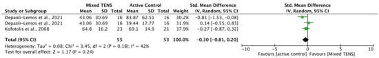 3.4.5. Mixed TENS versus Active Controls at Post-Intervention