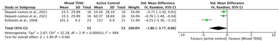 One study assessed the effect of TENS against active control on trunk ROM in flexion and extension. Kofotolis et al. (2008) [28] compared 40–45 min of TENS with 30–45 min of rhythmic stabilization exercises. At post-intervention, the exercise group had significantly greater trunk flexion ROM than the TENS group (66.4 (5.4) vs. 61.1 (3.9), p < 0.05) and significantly greater trunk extension ROM than the TENS group (27.4 (1.1) vs. 24.5 (2.7), p < 0.05).