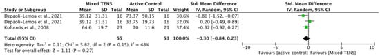 3.6.6. Mixed TENS versus Active Controls at 1 Month Post-Intervention