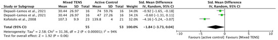 The same comparisons were made at 1 month post-intervention. For trunk flexion endurance, the meta-analysis revealed that mixed TENS was comparable to the active control (pooled SMD = −0.30, 95% CI = −0.84, 0.23). The comparisons made in this analysis had a moderate degree of heterogeneity (I2 = 48%). For trunk extension endurance, the meta-analysis revealed that mixed TENS was comparable to the active control (pooled SMD = −1.84, 95% CI = −3.73, 0.04). The comparisons made in this analysis had a high degree of heterogeneity (I2 = 94%). The results are presented below in Figure 4 and Figure 5.