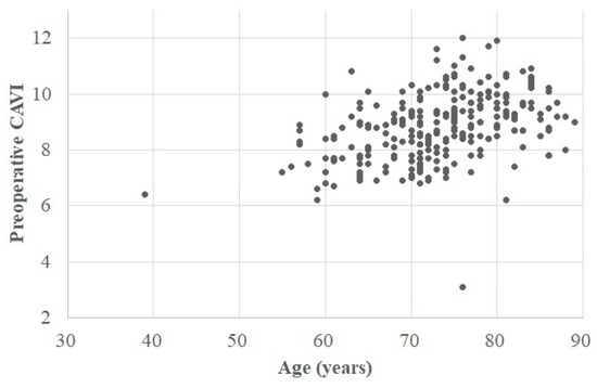 Scatterplot of preoperative CAVI and age. The horizontal axis indicates patient age, and the vertical axis indicates the preoperative CAVI. Correlation equation: CAVI = 4.064 + 0.065 × AGE. CAVI, cardio-ankle vascular index.