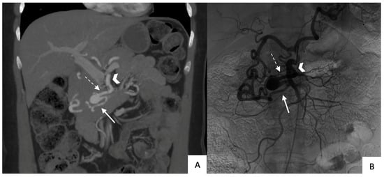 - Flood, K.; Nicholson, A. Inferior Pancreaticoduodenal Artery Aneurysms Associated with Occlusive Lesions of the Celiac Axis: Diagnosis, Treatment Options, Outcomes, and Review of the Literature. Cardiovasc. Interv. Radiol. 2013, 36, 578–587. [Google Scholar] [CrossRef]