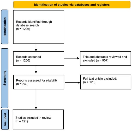 In total, 1206 publications were identified using the strategy described. After screening by title/abstract, 249 were selected for full-text screening. Of these, 121 were selected for inclusion (Figure 1).