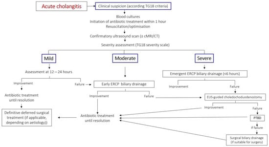 Empirical antibiotic treatment, together with initial resuscitative measures, is effective in 74–85% of cases, in which biliary decompression can be delayed by 48–72 h [51]. The TG18 guidelines state that early diagnosis, antibiotic treatment, and bile duct drainage are all essential, regardless of the severity of the condition [4].