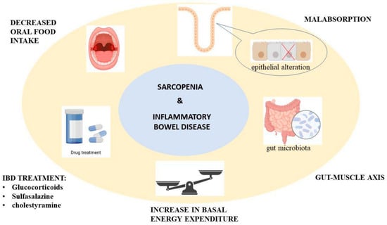 There are many mechanisms through which IBD causes sarcopenia. One of them is malnutrition, which accompanies IBD and is mainly caused by decreasing oral food intake and malabsorption, secondary to the epithelial alteration of the gut mucosae with altered transport functions. Impaired nutritional status is also caused by increased basal energy expenditure and the drugs used for treating IBD, like glucocorticoids, sulfasalazine, and cholestyramine [15]. The gut–muscle axis is the name given to the relationship between gut microbiota and sarcopenia. More studies are needed regarding this topic, but it is thought that muscle mass and function are affected by the capacity of gut microbiota to regulate systemic inflammation, immunity, energy metabolism, and insulin sensitivity, as seen in Figure 1 [16].