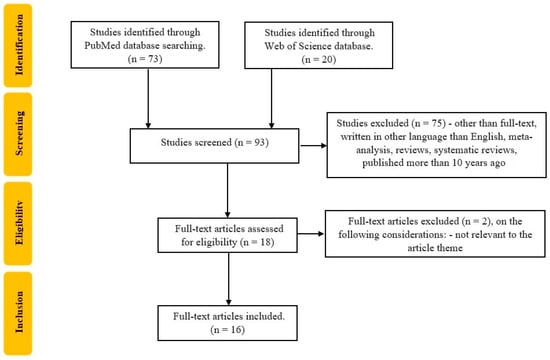 The literature search was conducted using the electronic PubMed and Web of Science databases, following the keywords: (“sarcopenia diagnosis” [All Fields]) AND (“inflammatory bowel disease” [All Fields]), and 93 articles were identified (73 articles on PubMed and 20 on Web of Science), published in English, before 11 March 2023 as original articles. The research question was constructed according to the Population, Intervention, Comparison, and Outcome (PICO) method, and the population was represented by IBD adults’ population with a diagnosis of sarcopenia.