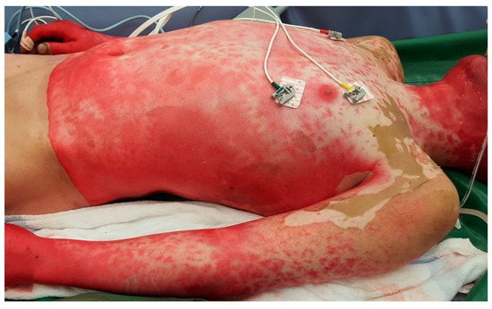 Grade III burn injury during the admission process to our burn unit. The patient suffered from a domestic fire, the injuries affected about 70% of TBSA, and the ABSI was 11. After cardiorespiratory stabilization, the burn wounds were cleaned of loose debris. As a next step, the wounds were treated with antiseptic solution before the bandaging was applied.