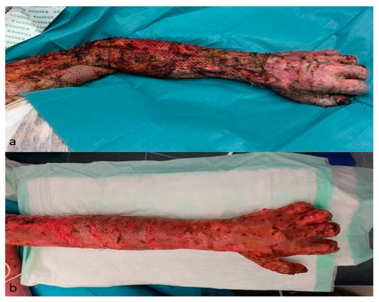 Grade III burn injury of the left upper extremity. (a)—Five days after necrosectomy and covered by meshed allograft skin (both hands were covered with unmeshed autograft). (b)—Three weeks after removal of the allograft and replacement by autografts.