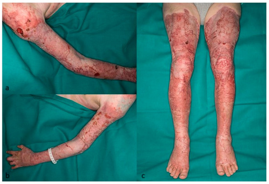 The skin allografts served as wound coverage for 12–14 days and were then removed and replaced by autologous skin grafts (Figure 5a,b and Figure 6a–c).