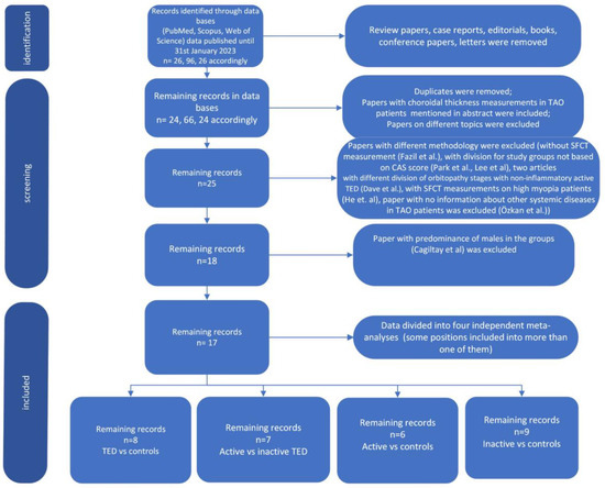 Databases such as PubMed, Scopus and Web of Science were used for the analysis. The screening of the results was based on the phrases: (Graves’ ophthalmopathy) OR (thyroid eye disease) OR (Graves’ orbitopathy) OR (thyroid-associated orbitopathy) AND (choroidal thickness) AND (optical coherence tomography) OR (OCT). The pool of papers was narrowed down to articles published until 31 January 2023 (26, 26 and 96 papers, respectively). Twenty-five (25) articles were taken into consideration after repetitive papers were eliminated. The papers considered were original articles and included the choroidal thickness measurements among TED patients in their results. The meta-analysis was conducted in two steps. At the beginning, we presented a comparison of SFCT results in a group of TED patients compared with healthy controls. Then, we extended our analysis to differentiating the SFCT parameter in groups with different levels of TED activity. Some papers were part of more than one analysis. The size of the study was limited due to methodological discrepancies. Studies in which results were reported as median and range; median, range and interquartile range; or mean value but without standard deviation were not included in the analysis. The flow diagram describes the study selection method (Figure 1).