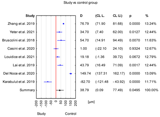 The mean difference between the TED group and the healthy group was 38.79 μm with a CI of 0.09 to 77.49 μm. This result is statistically significant (p = 0.0495) (Figure 2).