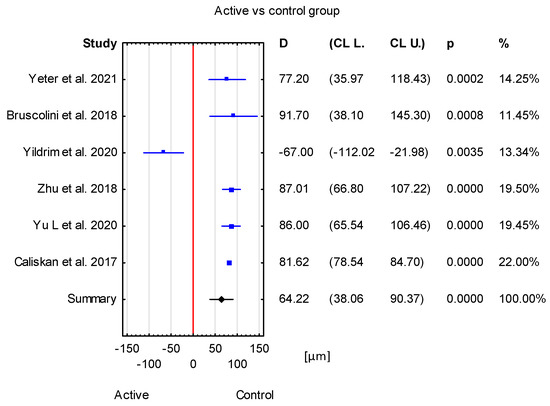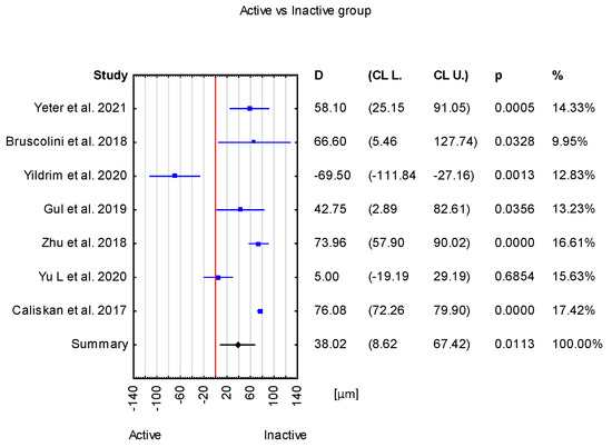Forest plot of mean difference of SFCT between active and inactive group, p value indicating level of statistical significance. The size of the box represents the point estimate for each study in the forest plot and is proportional to that study’s weight-estimate contribution to the summary estimate. Horizontal lines represent 95% CL [12,13,17,18,21,22,23].