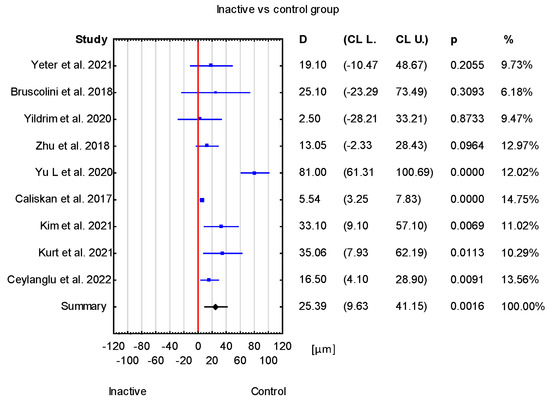 The obtained mean difference between the active TED group and the healthy group was 64.22 μm with a CI of 38.06 to 90.37 μm. This result is statistically significant (p < 0.001) (Figure 5).