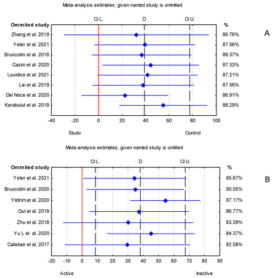 Limitations that may affect the final outcome of the present meta-analyses are the heterogeneous duration of Graves’–Basedow disease (from 1 month [17] to almost 19 years [15]), the duration of the ocular involvement (the average time was mentioned from circa 2 years [16] to 6 years [18]) or the lack of mention of this topic in some of the publications [12,13,14,24,25,26,27]. In papers published in Chinese or Korean, the aspect of disease duration was not available due to language limitations [20,22]. Furthermore, studies reported the duration of TED or Graves’ disease, which is not the same and may interfere with the correct interpretation of the final results. Another aspect is the ethnicity of participants (Italian, Turkish, Asian studies), which is connected with different anatomy of the orbits and the wide disparity in the age ranges of the groups of participants among the publications analysed. Nevertheless, an important confounding factor is the different way in which different authors select eyes for analysis—qualifying both eyes of the participant or selecting one of them. The sex distribution was remarkably similar between the studies selected for the final analysis, with a preponderance of women. Smoking status and BMI measurements should have been taken into consideration during planning the inclusion and exclusion criteria of participants in the research because they may significantly influenced the outcomes [44,45]. Technical issues, such us different OCT techniques and mainly manual SFCT measurements using calipers that depend on the researcher skills, can also cause a large discrepancy in the results. The one study led by Kurt used the SS-OCT technique with automatic measurement of the parameter. Figure 6 demonstrates that omitting this paper has no significant impact on the overall active vs. inactive group analysis.