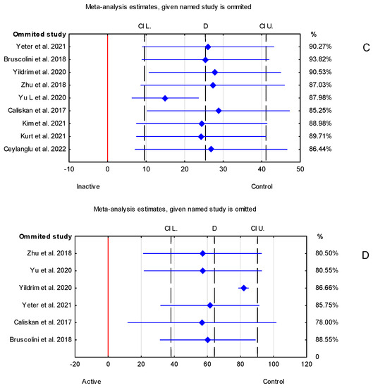 Sensitivity analysis for the effect of individual studies (given named study in the Y axis is omitted) on the pooled difference of SFCT parameter. CI (confidence interval). (A) Control vs. study group, (B) active vs. inactive group, (C) inactive vs. control group, (D) active vs. control group [12,13,14,15,16,17,18,19,20,21,22,23,24,25,26,27].