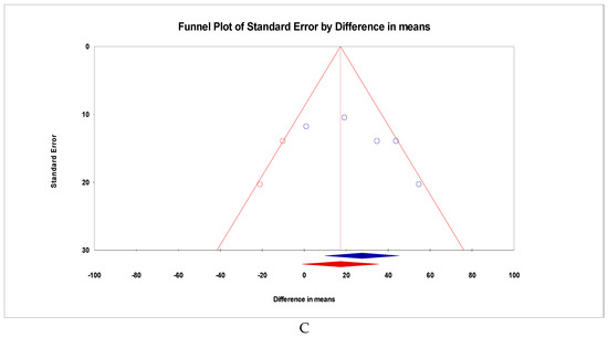 The trim-and-fill method was used to estimate the effect of potentially missing studies due to publication bias in the funnel plot. After trimming the studies that caused the funnel plot’s asymmetry [14,20,26], the SFCT result was 27.55 μm (95% confidence interval from 13.26 to 36.26 μm). Using trim-and-fill, the imputed point estimate was 17.29 μm (95% confidence interval from −1.02 μm to 35.60 μm) (Figure 7B,C).