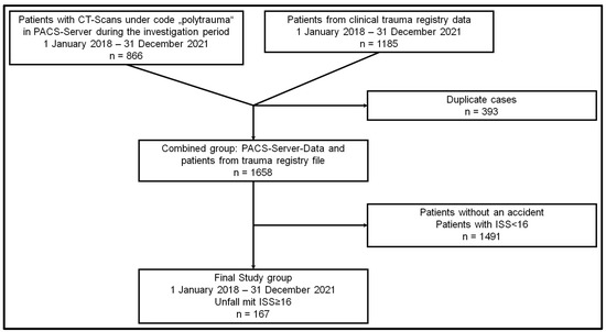 After excluding duplicate and miscoded cases and patients with an ISS below 16, the final study cohort of 167 patients was created from the hospital’s internal trauma registry database and data from the Picture Archiving and Communication System (PACS) server (Figure 1).