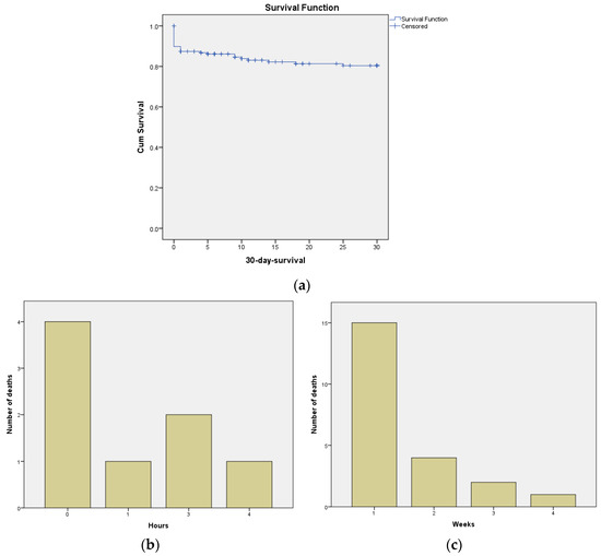 Representation of Mortality Rate within the First 30 Days: (a) Kaplan–Meier Curve of 30-day survival (Censored, refers to the status of patients for whom the event of interest (death) has not occurred within their personal follow-up duration.), (b) mortality rate in the first hours, and (c) mortality rate in the first weeks.