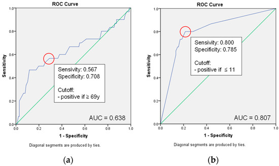 The cutoff values of the influential metric parameters were determined by the ROC curves for age (cutoff: age 69 years and older) and GCS (cutoff: GCS 11 and below) shown in Figure 3.