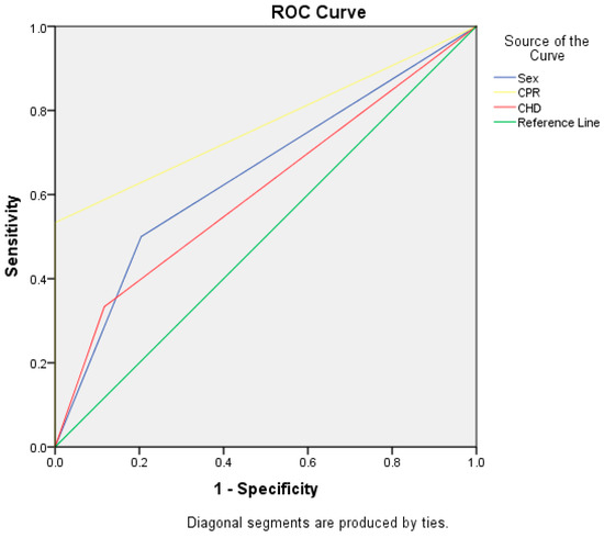 To complete the analysis, ROC curves for CPR (AUC = 0.767), CHD (AUC = 0.608), and Sex (AUC = 0.648) are given in Figure 4.