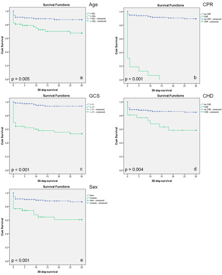 To confirm the calculated thresholds and assess the significance of the nominal parameters, Kaplan–Meier analyses were conducted. Significant differences in 30-day survival were confirmed for age ≥ 69 years, CPR, GCS ≤ 11, existing CHD, and female sex (Figure 5).
