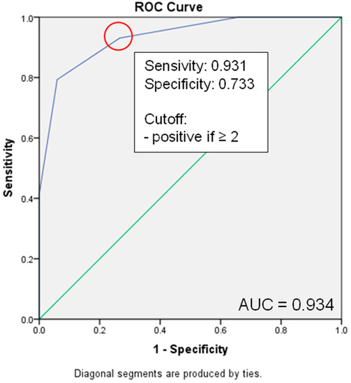 After calculating the ROC curve, a significant increase in mortality could be predicted with a threshold of ≥2, achieving a sensitivity of 93.1% and a specificity of 73.3% (Figure 6).