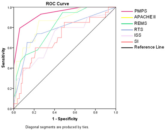 After adding up all the points, a minimum of 0 and a maximum of 6 points can be achieved. A higher score is associated with higher mortality. The threshold for a significant increase in mortality is ≥2 points. The AUC of the developed score (PMPS 0.934) was compared to both prehospital scores (SI (0.697), RTS (0.774) and clinical scores (APACHE II (0.846), REMS (0.808), ISS (0.697)) derived from the study cohort data, revealing a significantly better performance in mortality prediction (Figure 7).