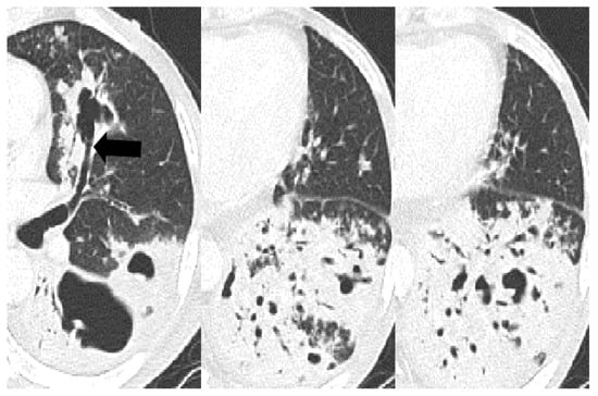 - Cha, J.H.; Han, J.; Park, H.J.; Kim, T.S.; Jung, A.Y.; Sung, D.W.; Lee, J.H.; Kim, J.E.; Han, D.H. Aneurysmal appearance of medium-sized bronchi: A peripheral manifestation of endobronchial tuberculosis. AJR Am. J. Roentgenol. 2009, 193, W95–W99. [Google Scholar] [CrossRef]