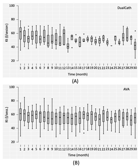 (A) The effective urea clearance (eKt) achieved in liters per session over the 30-month follow-up period using DualCath (abbreviated as DCath). (B) The effective urea clearance (eKt) achieved in liters per session over the same 30-month follow-up period using arteriovenous access (abbreviated as AVA).
