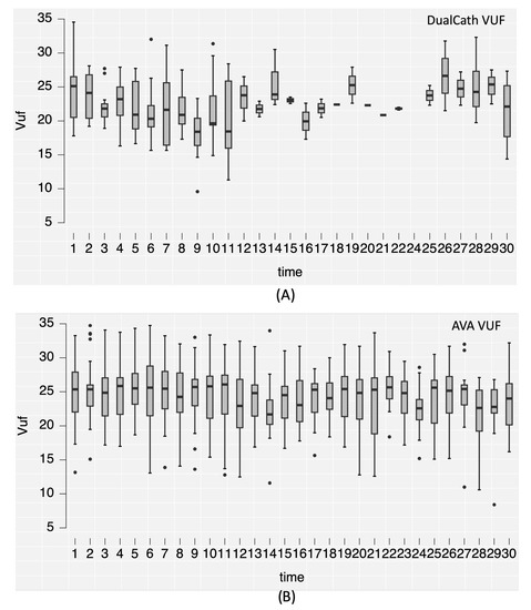 (A) The convective volume (Vuf) achieved in liters per session over the 30-month follow-up period using DualCath (abbreviated as DCath). (B) The convective volume (Vuf) achieved in liters per session over the same 30-month follow-up period using arteriovenous access (abbreviated as AVA).