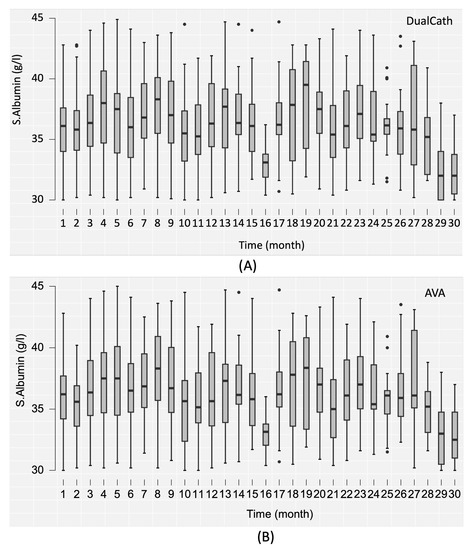 (A) The serum albumin (s.albumin) values in grams per liter (g/L) over the 30-month follow-up period using DualCath (abbreviated as DCath). (B) The serum albumin (s.albumin) values in grams per liter (g/L) over the same 30-month follow-up period using arteriovenous access (abbreviated as AVA).