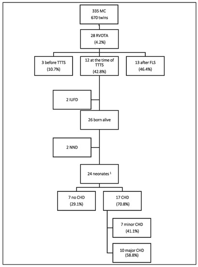 - Eschbach, S.J.; Boons, L.S.T.M.; Van Zwet, E.; Middeldorp, J.M.; Klumper, F.J.C.M.; Lopriore, E.; Teunissen, A.K.K.; Rijlaarsdam, M.E.; Oepkes, D.; Ten Harkel, A.D.J.; et al. Right ventricular outflow tract obstruction in complicated monochorionic twin pregnancy. Ultrasound Obstet. Gynecol. 2017, 49, 737–743. [Google Scholar] [CrossRef]