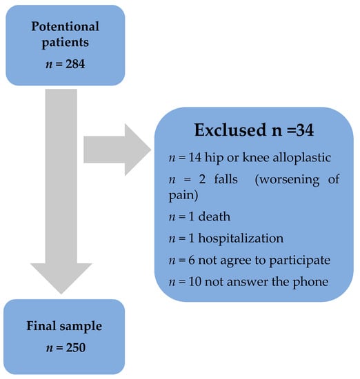 A total of 284 patients were approached. Of these 284 patients, 34 patients were excluded because they did not meet the inclusion criteria. Reasons for exclusion: n = 14 hip and knee alloplastic at the time of post-operative data collection; n = 2 falls and subsequent worsening of pain at the time of post-operative data collection; n = 1 death; n = 1 internal medicine problems and hospitalization at the time of post-operative data collection; n = 6 did not agree to participate in the study; and n = 10 did not answer the phone. Therefore, the final sample was composed of 250 patients (Figure 1).