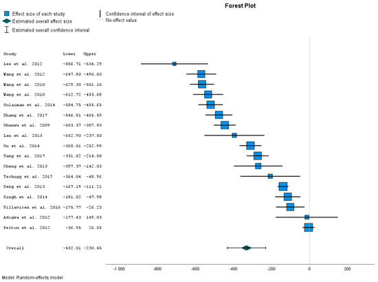 The calculated data present the Effect Size Estimates for Individual Studies (blood loss). The data show that the blood loss (mL) of patients after the MIS-TLIF is significantly lower than blood loss within OTLIF. This was confirmed by comparing our treatment group with control samples in 15 different studies [,,,,,,,,,,,,,,] was not significant.