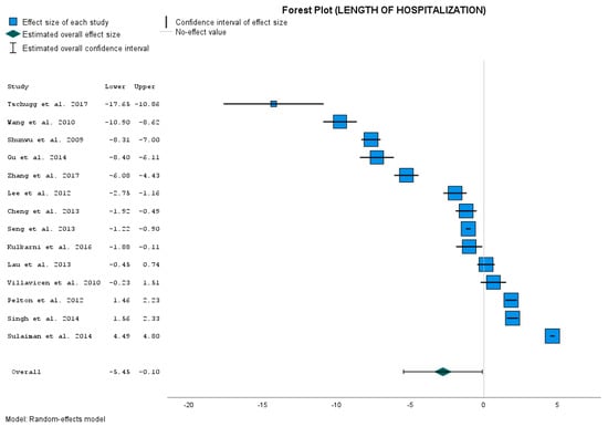 The calculated data show that LOS (days) was significantly shorter in MIS-TLIF group compared to the OTLIF control group in only nine studies [,,,,,,,,,,,,,,,,,]. In two studies, we have comparable results [,]. In the last three studies, we can see significantly shorter LOS in the control group compared to our treatment group (Figure 3). So there is a significant difference in the opposite way.