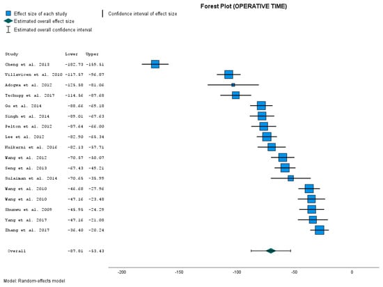 The overall mean effect size was −70.269 min. This value represents the point estimator of the average reduction in operative time (min) with the MIS-TLIF method. Its 95% CI from −87.609 to −52.929 gives us the interval estimation for the reduction in operative time in minutes. The p-value is < 0.001. So the overall result is statistically significant. The obtained results confirm that operative time during MIS-TLIF is significantly shorter than during OTLIF.