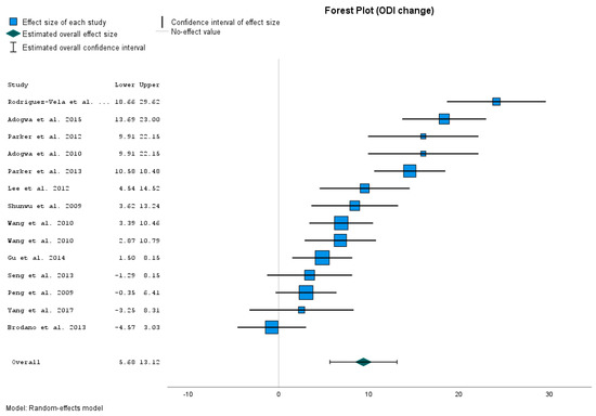 The following supporting information can be downloaded at https://www.mdpi.com/article/10.3390/jcm12144755/s1, Questionnaire S1: ODI index questionnaire; Table S1: Tests of Homogenity and Heterogeneity Measures.