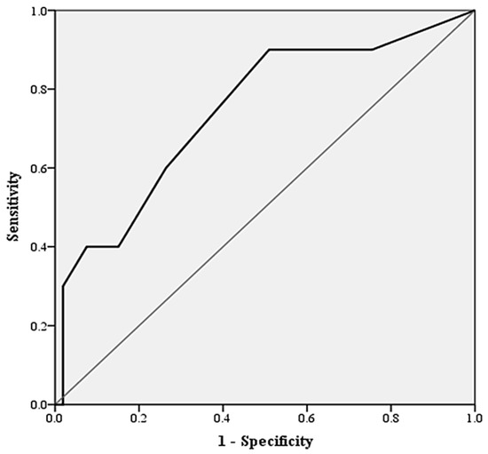 ROC curve characteristics of CONUT score for predicting complications in microvascular flap surgery; receiver operator curve characteristics and area under curve of CONUT score for predicting the presence of flap complications other than true flap loss. CONUT scores had an AUC of 0.813 (CI95 0.659–0.967, p = 0.012).