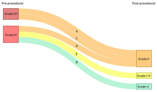 Atrioventricular (AV) valve regurgitation before and after transcatheter valve intervention. Each line represents a single patient (A–E corresponding to patient A–E, respectively).
