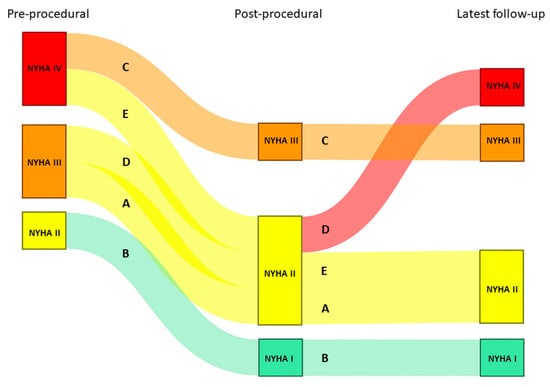 NYHA functional class before and after the transcatheter valve intervention, as well as at latest available follow-up. Each line represents a single patient (A–E corresponding to patient A–E, respectively).