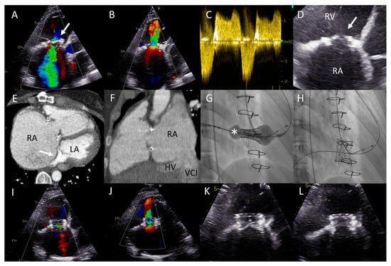 (A) Color Doppler apical four-chamber view shows severe tricuspid regurgitation (TR) with a wide vena contracta (arrow) and a systolic jet reaching the roof of the enlarged right atrium (RA). (B) Color Doppler showing turbulent inflow through the tricuspid valve (TV) bioprosthesis and aliasing, mean gradient was elevated at 4–5 mmHg. (C) Continuous wave Doppler showing a dense TR signal with low velocity. (D) Calcified and degenerated tricuspid bioprosthesis (arrow). (E) Axial slice through a computed tomography (CT) scan at the level of the right ventricle shows a giant RA and an intra-atrial septum deviation towards the left atrium (arrow), partially suppressing it. (F) Sagittal CT slice shows the inflow angle of the inferior vena cava-right RA and the RA-TV. Note the distended hepatic vein (HV). (G,H) Right anterior oblique fluoroscopy projections show the expansion of the Sapien 3 valve (asterisk) using the ring of the degenerated bioprosthesis as the reference and the final result, respectively. (I,J) Apical four-chamber color Doppler views showing normal function of the valve-in-valve bioprosthesis (appreciate the difference with (A,B), respectively). (K,L) View of the valve-in-valve bioprosthesis in systole (closed) and diastole (open), respectively.