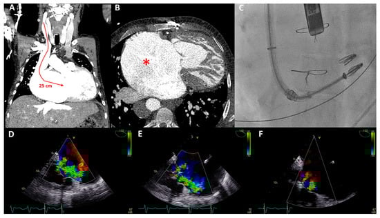 (A) Distance between the right internal jugular vein and tricuspid valve (TV) measured on a computed tomography (CT) scan in a coronal plane (arrow). (B) Severely dilated mono-atrium (asterisk) on CT scan in a sagittal plane. (C) Implantation of the second XTW clip (note the first XTW clip already released) under transesophageal echocardiography (TEE) guidance. (D) Preprocedural TEE imaging of the torrential (IV+) TR. (E) Periprocedural TEE showing TR after placing the first XTW clip. (F) TEE showing the significant reduction in TR after placing the second XTW clip to grade I–II.