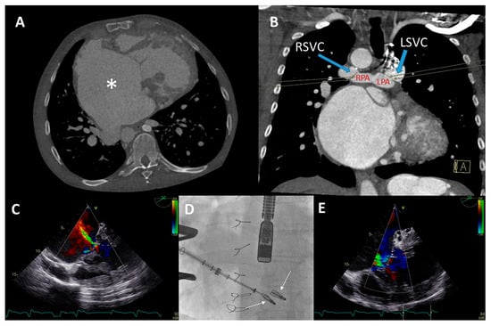 (A,B) Computed tomography (CT) scan of the thoracic cavity with the anatomical position of the dilated functional mono-atrium (asterisk) against the right thoracic wall (panel A) and bidirectional bilateral Glenn shunt (panel B) (LPA = left pulmonary artery, RPA = right pulmonary artery, LSVC = left superior vena cava, RSVC = right superior vena cava). (C) Pre-procedural transesophageal echocardiography (TEE) which visualized severe common atrioventricular (AV) valve regurgitation. (D) Anteroposterior fluoroscopic view of the two XTW MitraClips positioned in the AV valve. At the same time, it is appreciated that the delivery system is positioned through the fifth intercostal space after a right mini-lateral thoracotomy. (E) Moderate AV regurgitation after the hybrid procedure visualized with TEE.